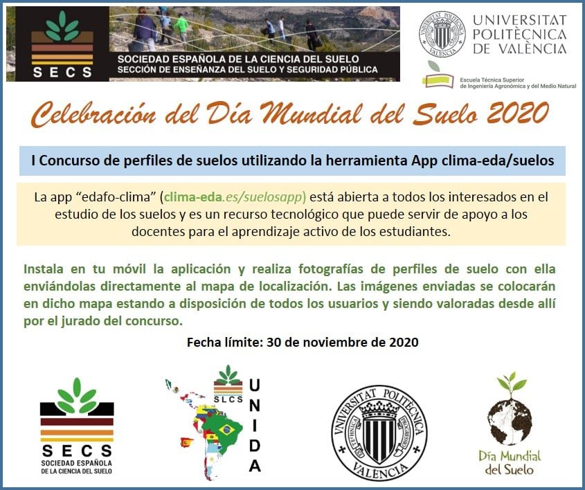 - Jornada del Día Mundial del Suelo desde Pamplona. La cartografía de suelos en Navarra: realización, utilización y difusión. Un ejemplo de aplicación: «La cartografía de suelos en Navarra: realización, utilización y difusión. Un ejemplo de aplicación.”. Fco Javier Eslava Lecumberri. 10 de diciembre de 2020 de 18,30h a 19,30h, seguimiento online mediante videoconferencia. Jornada gratuita con inscripción previa