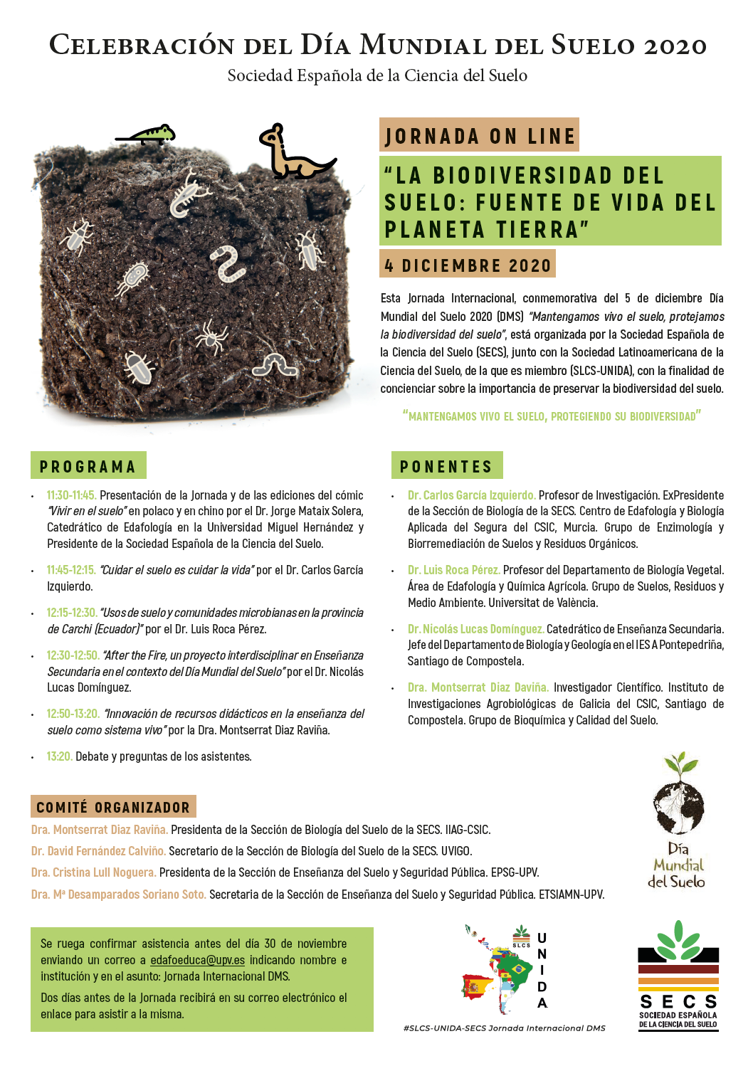 - Jornada on-line: «La biodiversidad del suelo: fuente de vida del planeta tierra«. 4 de diciembre de 2020. Organiza: Secciones de Biología del Suelo y de Enseñanza del Suelo de la SECS. Enlace al video de la jornada / Descarga Presentación Carlos García-Izquierdo / Descarga Presentación Nicolas Lucas / Descarga Presentación Montse Díaz-Raviña